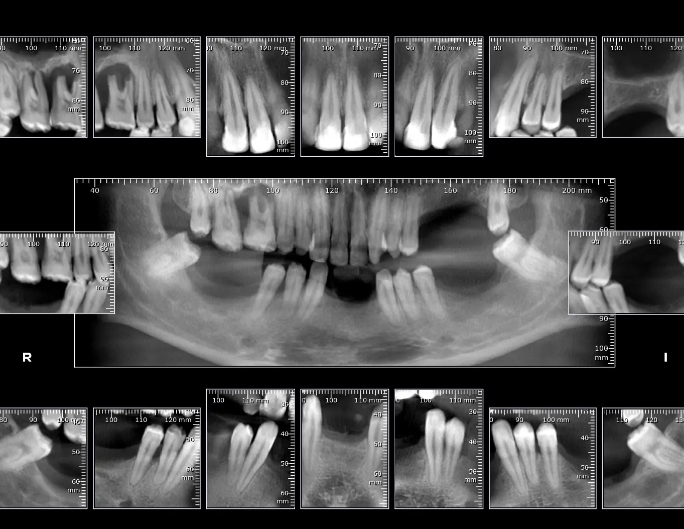 Ofrecemos una vista completa de ambos maxilares, útil para evaluar fracturas mandibulares, órganos dentarios retenidos, malposición dental, presencia de terceros molares y patologías en huesos y dientes. Tamaño: 20 x 25 cm.